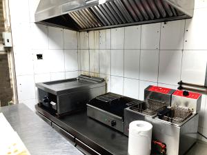 La cocina de 10 metros que esta completamente acondicionada con salida de humos, 2 neveras, 1 congelador, plancha eléctrica, 2 freidoras, lavavajillas e instalación de gas.