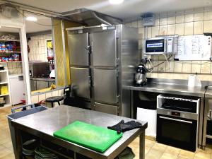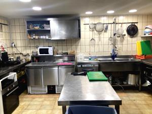 La cocina de 30m² se encuentra en la segunda planta, acondicionada con salida de humos, nevera, 2 congeladores, horno, 2 microondas, plancha, 2 freidoras eléctricas, 4 fogones, batidora, envasadora, robot cocina y cortadora de verduras.